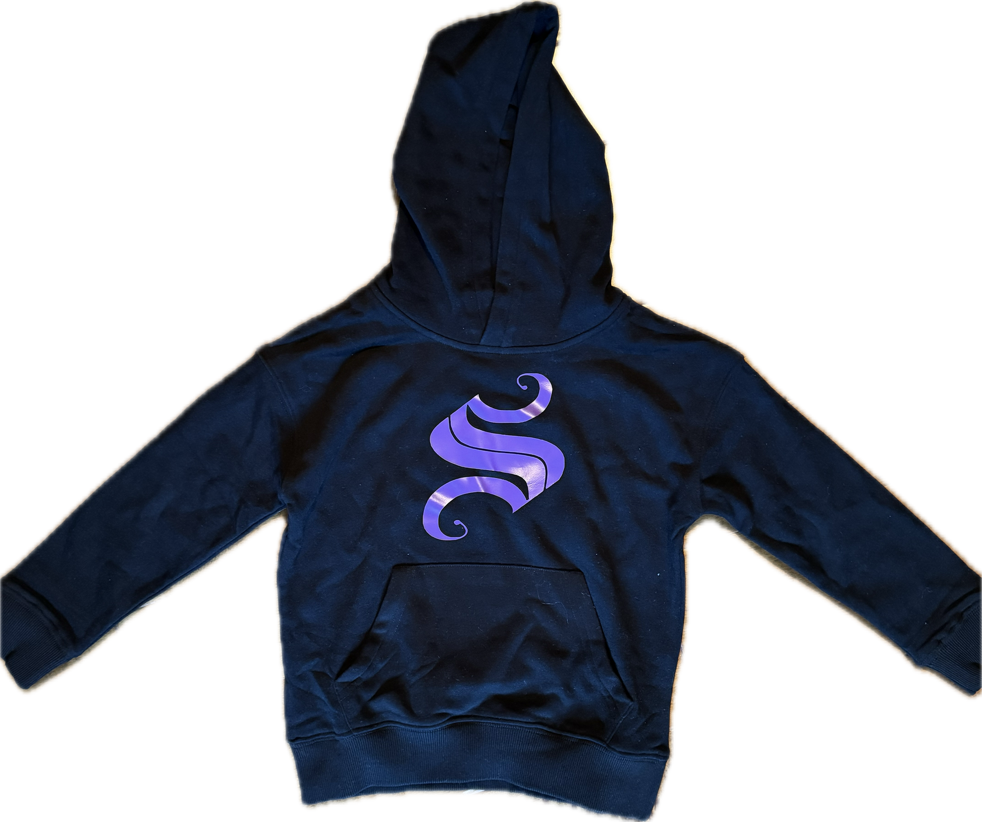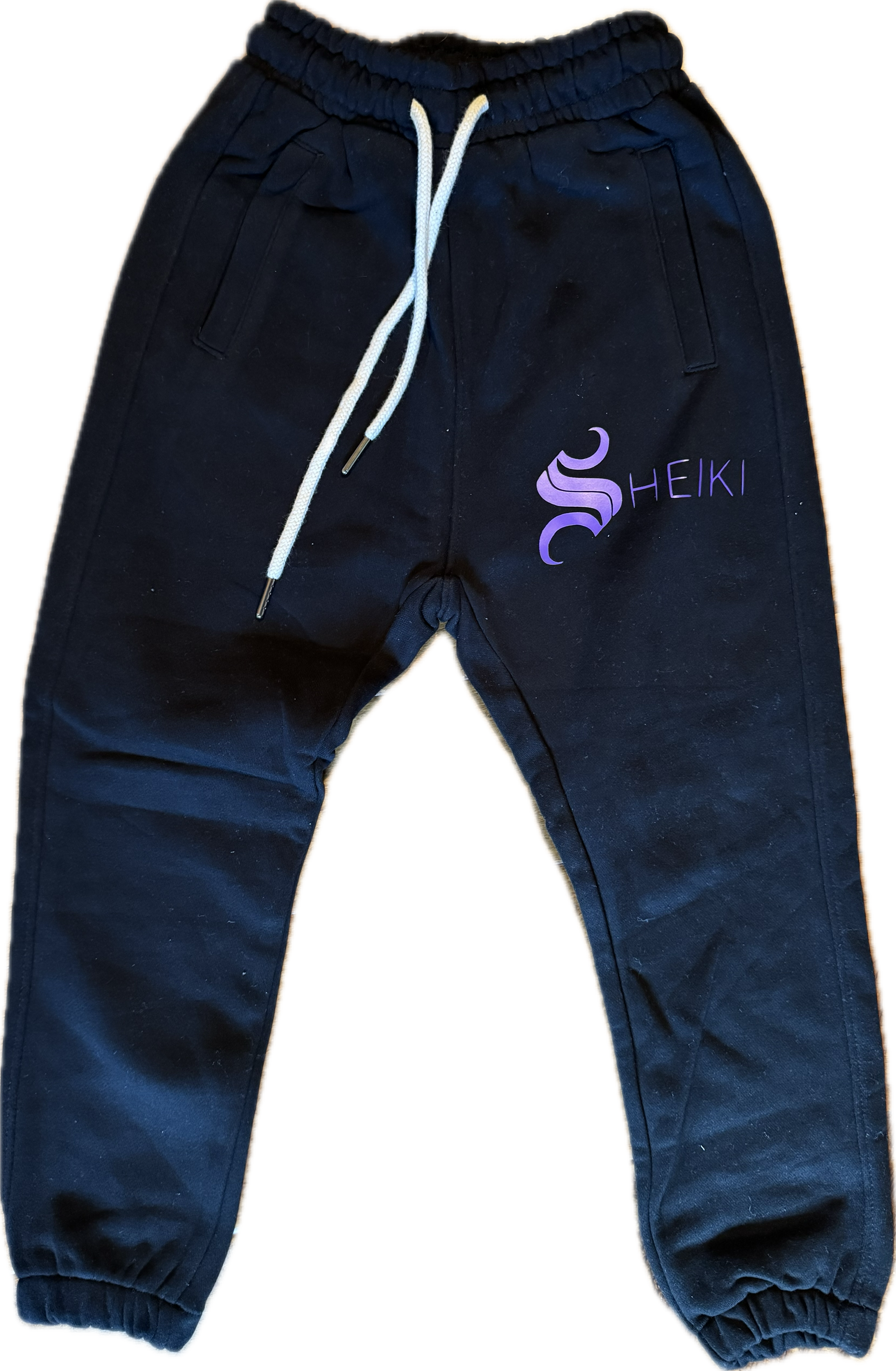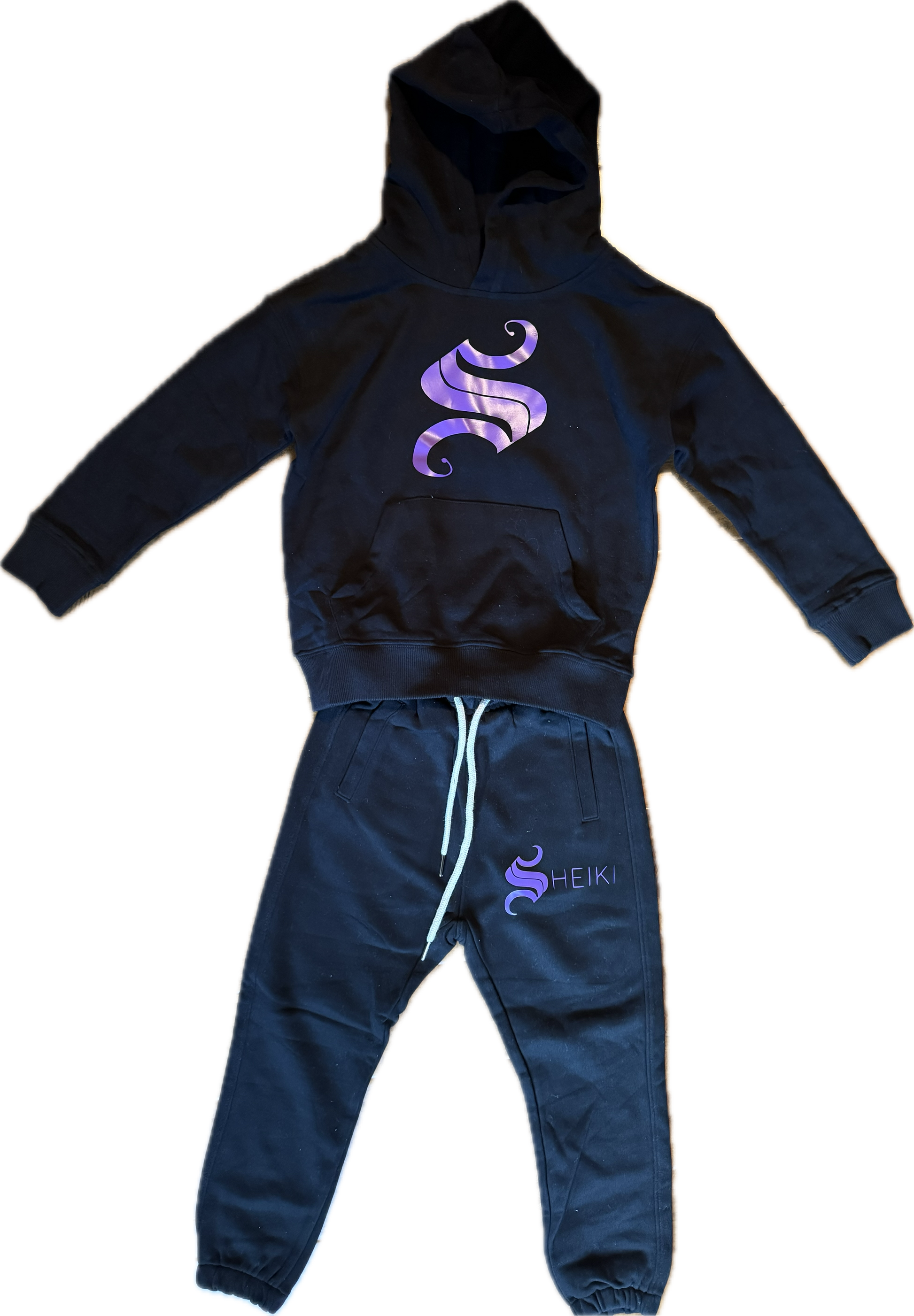 kids ages 3-5 unisex jogger set in black with purple sheiki logo. Set include both hoodie & joggers.