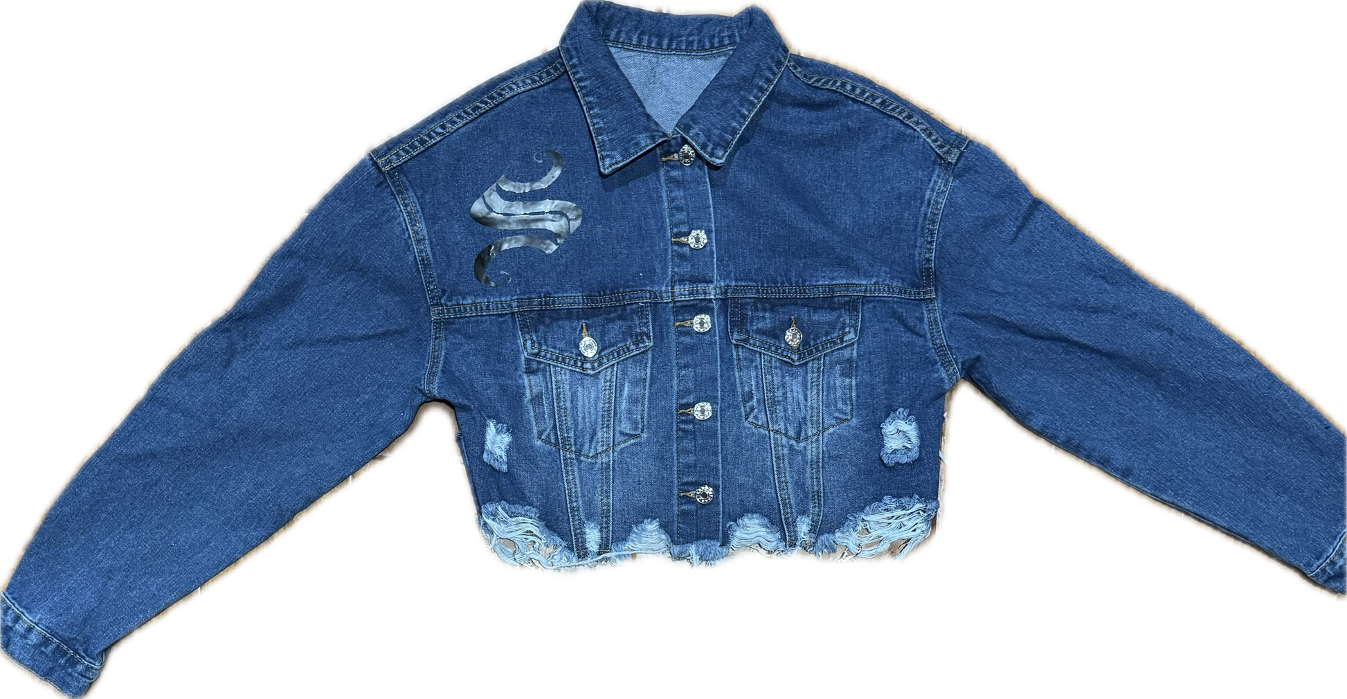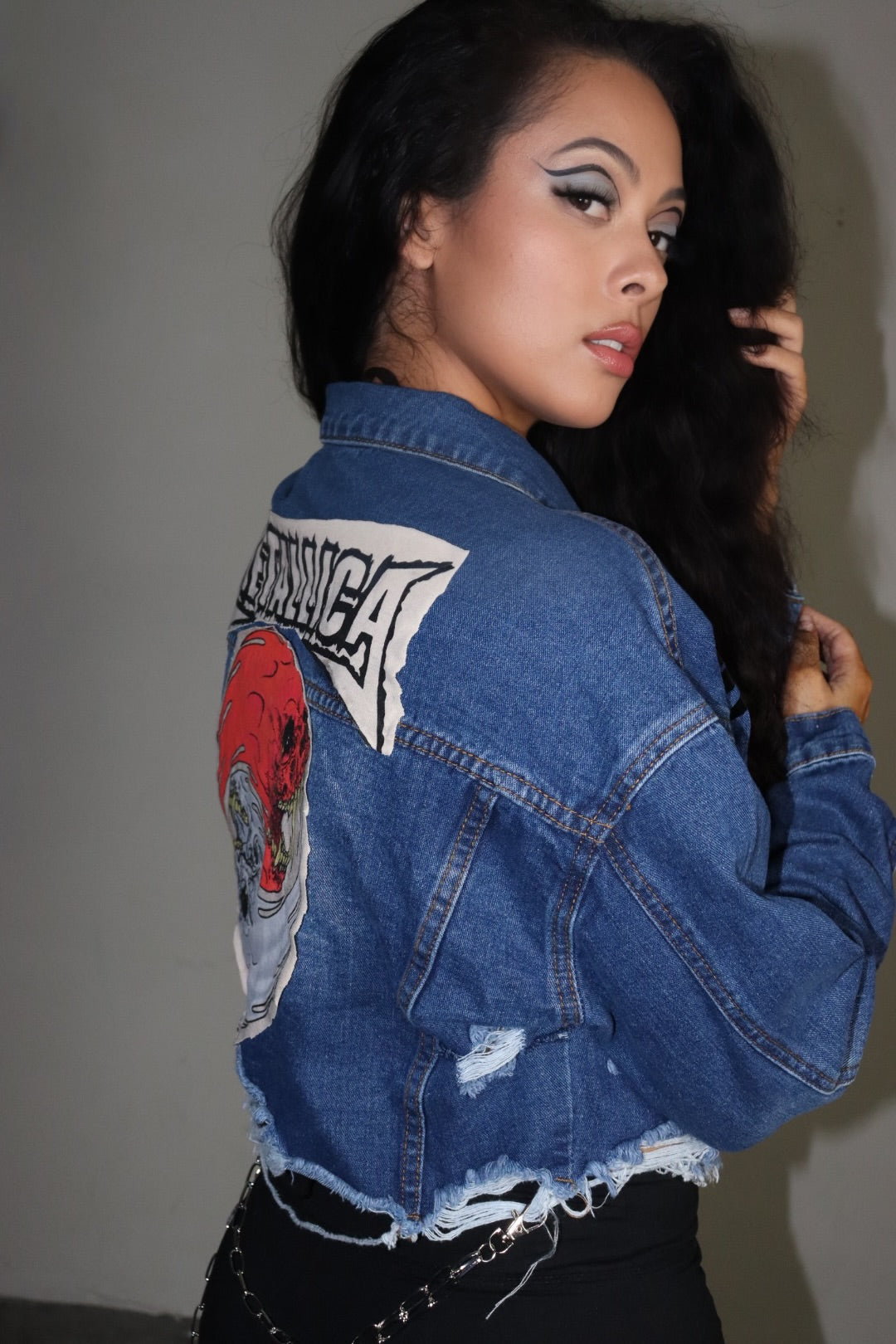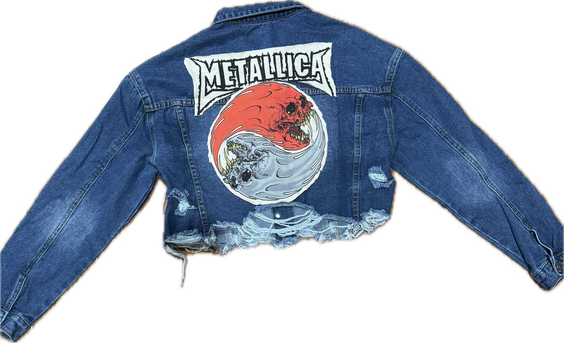 Denim dark wash, distressed with chain accessories. Metalica applique on back of jacket, this denim jacket is 100% hand made by sheiki jeans.